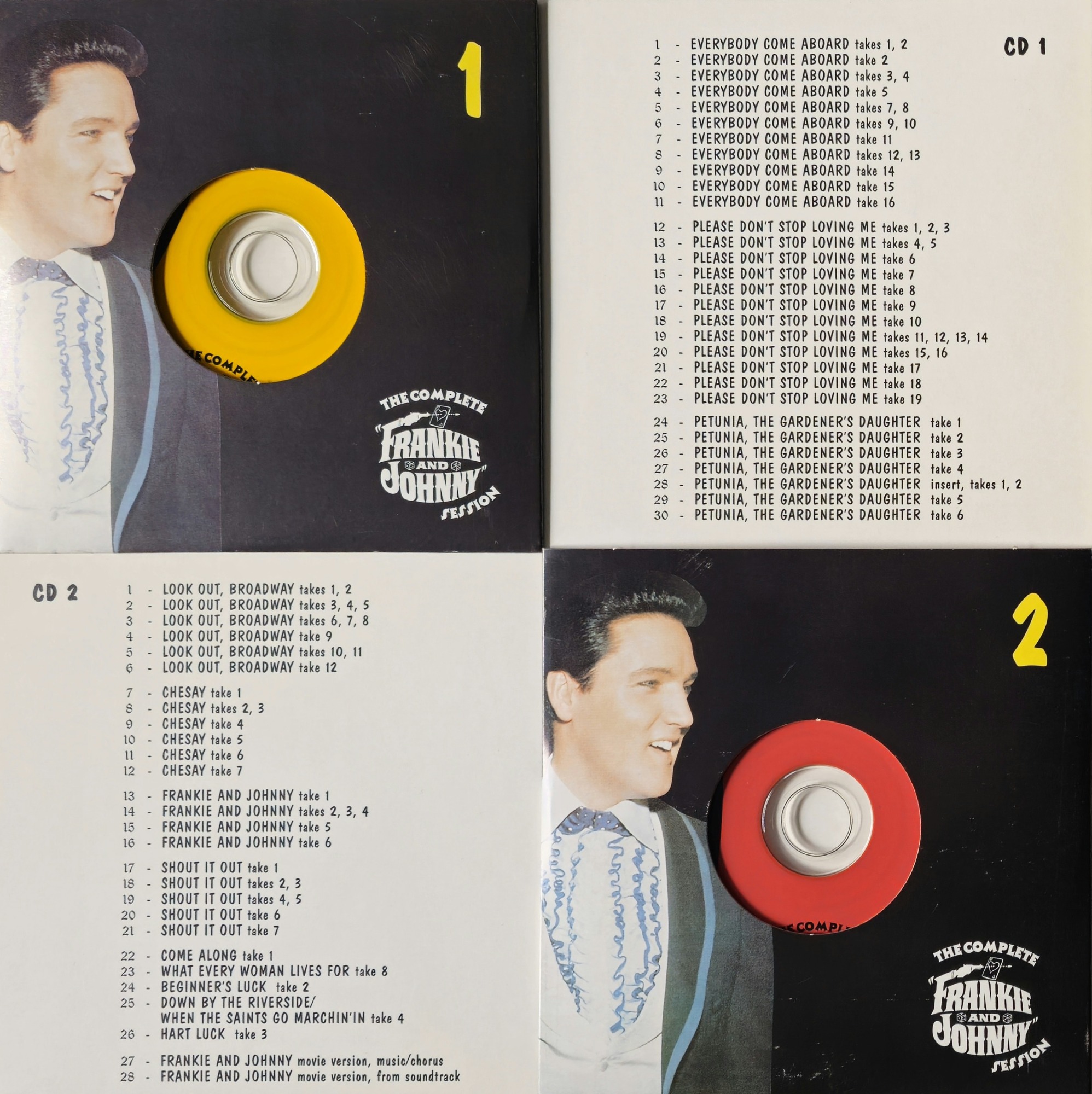 Zo af en toe pak ik es een oude import cd en waan me dan even terug naar de jaren '90. Zoals ook met deze 2, 10 inch import sets van het label Famous Groove. Deze 2 sets zijn uitgebracht in 1997 en waren destijds een zeer gewilde aanwinst voor de verzamelaar. Beide sets staan bomvol takes van alle nummers uit beide films, en we hebben het hier dan over de films “Spinout” en “Frankie and Johnny”. Naast deze geweldige 2 sets hadden ze ook al “Studio B sessions vol.1, 2 en 3“ uitgebracht (1995, 1996 en 2002) en in 1997 zagen we de cd “Movie session memories”. Maar even terug naar de 10 inch setjes, er word gezegd dat niet alle tapes zijn gevonden van de sessies en dat sommige gewoon weg waren. Kijken we naar de verpakking dan moet ik toch zeggen petje af hoor, ziet er zeer mooi uit en zeker voor die tijd. De tracklist van beide sets staat zowel op de achterkant als op de kartonnen houder waar de cdhoesjes opgeplakt zitten. De kwaliteit is goed te noemen van alle takes, veel geouwehoer tussen door natuurlijk maar er werd ook serieus wel iets opgenomen. In totaal heeft dit label ons verrast met 6 titels en daarna niks meer van vernomen helaas. Mocht je deze tegenkomen ergens dan zou ik zeggen, doen.